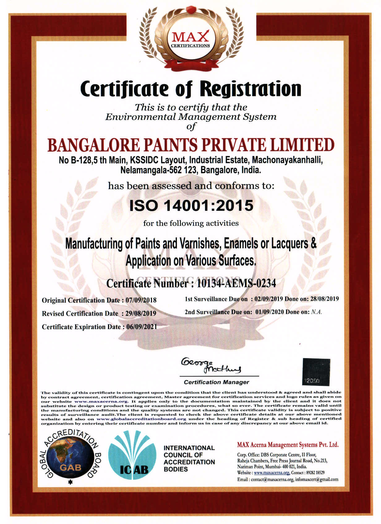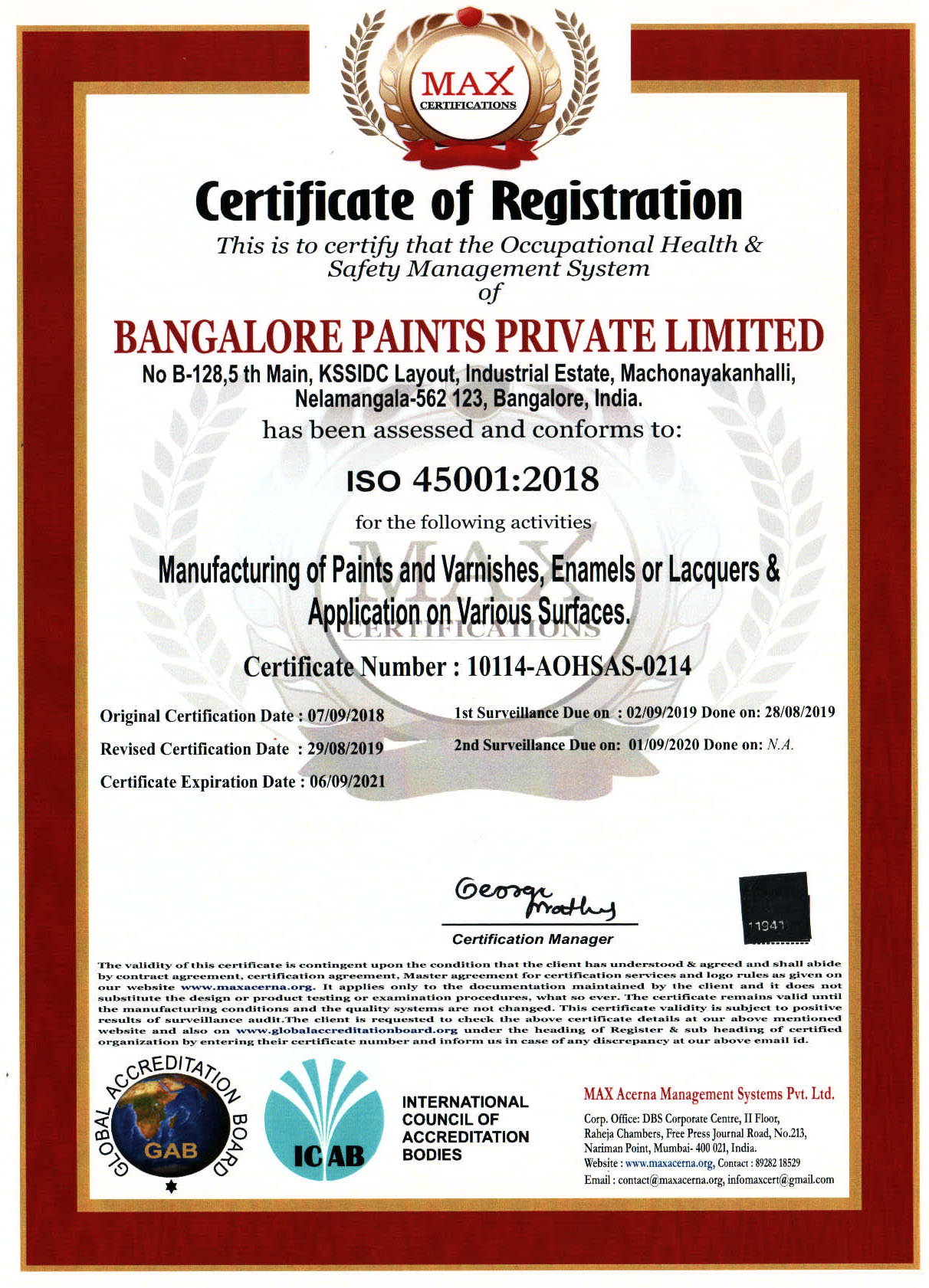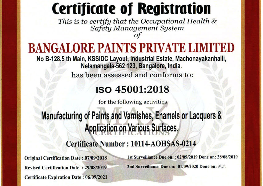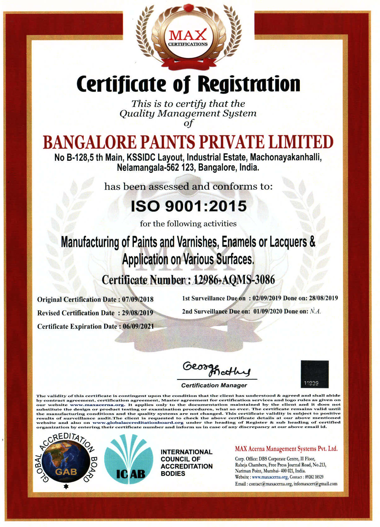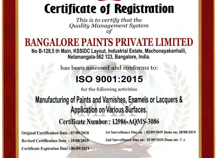 Bangalore Paints Private Limited (BPL) - ISO 9001:2015, was established in 1980 and is managed by the Shroff Group, which is a well-established group with diversified ac- tivities in trading, manufacturing and contracting. BPL, at its factory at Nelamangala, Rural Bangalore, manufactures the entire range of decorative paints - internal and external, masonry finishes and special industrial formulations paints/coatings.